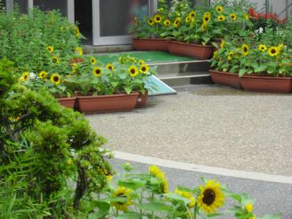 学校は、昨日、前期の夏季水指導が無事に終了しました。子どもたちのいない校舎は、少しさみしげです。でも・・・1学期に3年生が植えた1000粒のヒマワリの種。現在は3年生の各家庭に、そして学校の正面玄関、フェンス沿いなどに、今まさしく盛りと元気いっぱいに咲いています。ヒマワリの植えつけにあたっては農協関係者の皆様、地域の皆様にもたくさんのご協力をいただきました。感謝申し上げます。夏休みも中間点を迎えましたが、学校にお立ちよりの際は、ぜひ、ヒマワリの花をご覧ください。