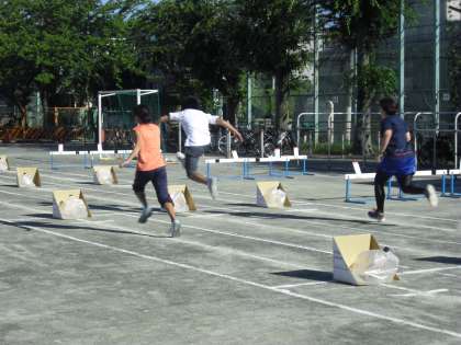 23日午後、近隣の小学校8校の先生方100余名が尾山台小学校に集まり、体育の授業の充実のために、リレー、長縄、ハードル走の指導法について学びました。暑い午後の日差しの中、実際に走ったり跳んだりと、汗を流しながらの研修になりました。指導してくださった講師は、各学校の体育主任です。