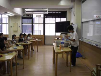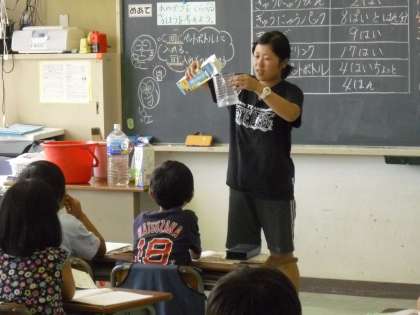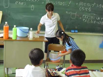 2年生の算数の授業の紹介です。2年生の算数では少人数指導の授業を行っています。今日はどのクラスも「水のかさ」の1時間目の学習です。1Lってどれくらいだろう? 子どもたちは実際の水のかさを確認しながら、学習を進めています。算数では、こうした作業的・体験的な活動など身体を使ったり、具体物を用いたりする活動(算数的活動)がとても大切になります。