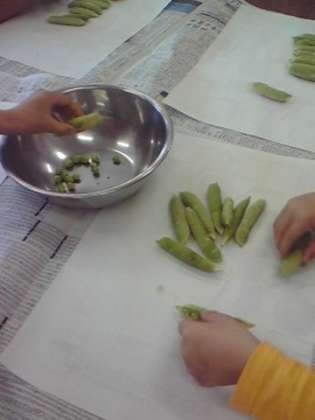 今日の給食、グリンピースご飯のグリンピースをむきました。給食が楽しみです。
