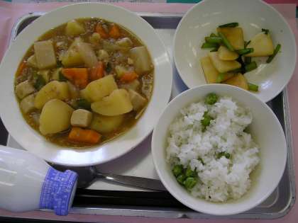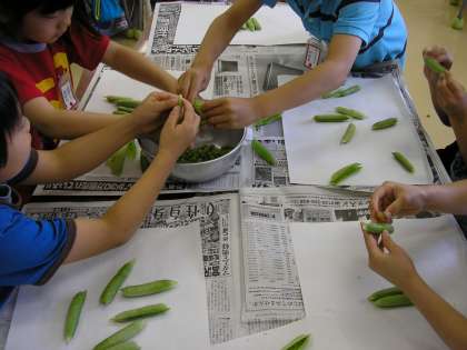 今日のごはんのグリンピースは、1年生のみんながさやの中から取り出すお手伝いをしてくれたものです。八百屋さんから立派なエンドウ豆が届き、子どもたちがさやから取り出すと”わぁ、大きい豆””豆が9個入ってる”など楽しそうにお手伝いをしてくれました。自分たちのむいた豆の入ったごはんをおいしくいただきました。