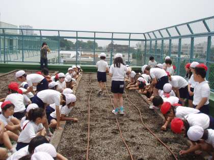 屋上に人工の畑ができました。3年生は、小松菜の種を植えました。代表の人たちが種をまき、水をやりました。収穫したら、給食で使ってもらえることになっています。小松菜達、元気に育ってね。