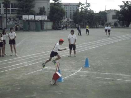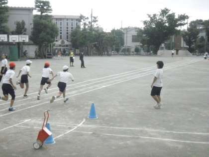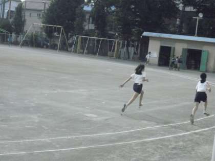 朝の6年生の練習風景です。当日のトラックの直走路、曲走路を再現して練習に取り組みました。