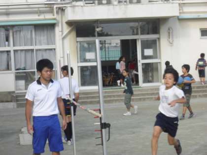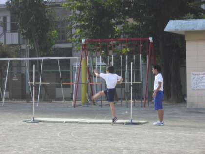 今日は、100メートル走と高跳びにエントリーしている子が朝から練習に励んでいました。校庭の周りには他の学年の子たちの姿があり、6年生ががんばっている様子を見て応援していました。