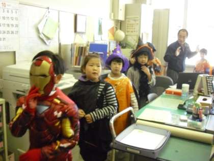 ハロウィン姿の子どもたちが学校に出現。写真は、職員室や事務室をねり歩いているところです。何かもらえたかな?
