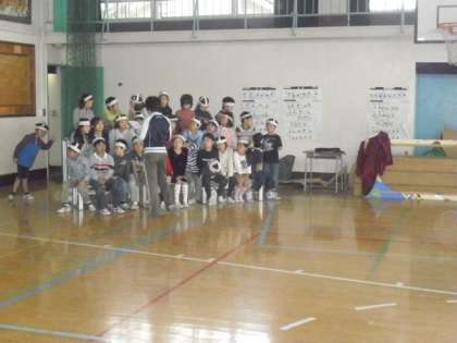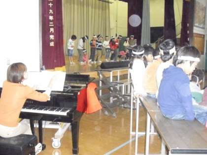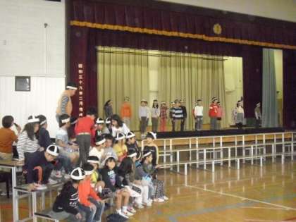 給食前の4時間目に体育館で練習です。ピアノの音に負けない元気な声でがんばって練習しました。子供たちの傍らには大道具も見えています。いよいよ本番に向けて緊張感が高まってきました。