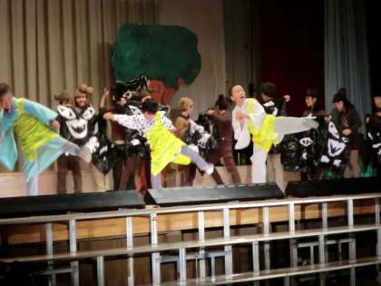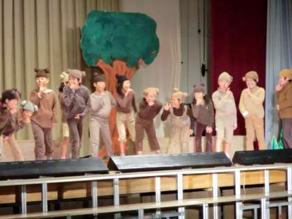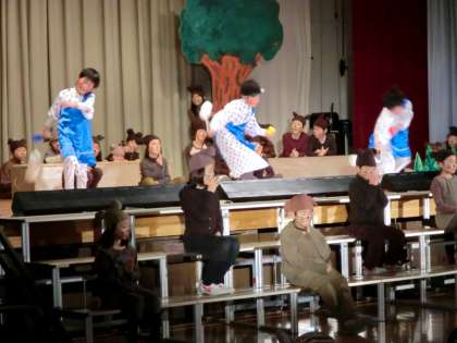 3年生の劇は「たぬきばやし」です。この劇には76匹のたぬきと和尚さんが登場します。かわいい子だぬきたちを元気いっぱいに一生懸命に演じる3年生・・・とてもかわいかったです。衣装の準備なども保護者の皆様からたくさんのご協力をいただき、劇を盛り上げていました。ありがとうございました。和尚さんは個性豊かで、強い和尚さん、酔っ払った和尚さんなど、名演技でした。