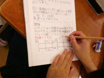 今日は速さについての問題を考えました。割合や速さ、単位当たり量は難しいですが、数直線を描くなどして考えています。みんな集中して頑張っています。
