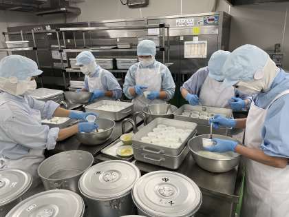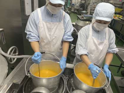 今日はとどろきフェスタ1日目ということで、少し豪華なデザートにしました。牛乳と砂糖、寒天、ゼラチンを使ってミルクゼリーを作り、黄桃缶をシロップごとミキサーにかけてソースを作り、ゼリーの上にかけて作りました。とどろきフェスタで子どもたちの生き生きとした素敵な姿を見ることができて、感動しました。明日もがんばってくださいね!