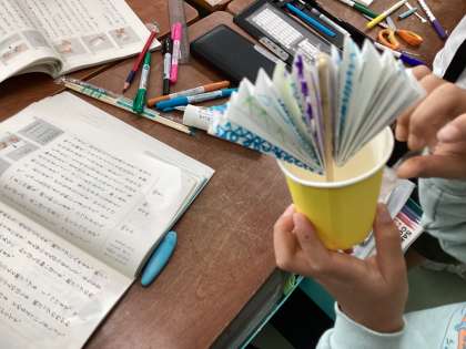 教科書の文章を見ながら「紙コップ花火」を作りました。「紙を谷おり・山おりにおるところが難しかったです。」「カラフルにすると花火らしくなりました。」と振り返りました。次回は、説明する文章から大事な言葉を見つけて行きます。