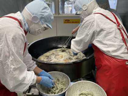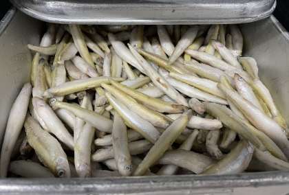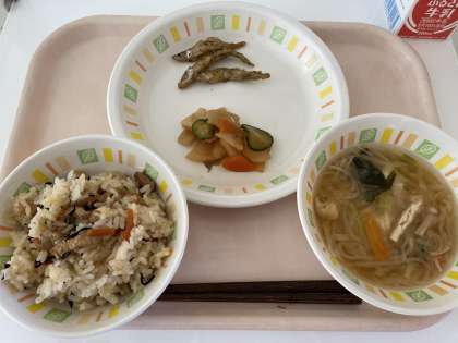 今日は「カムカム給食」の日でした。小魚は、「わかさぎ」に青のりと米粉と卵を混ぜ合わせた衣をつけて、カリッと揚げました。柔らかい骨なので、頭ごと丸ごとカリッと食べられました。もっと食べたい!という子もいれば、1匹も食べられません…という子もいました。骨ごと丸ごと食べられるので、かみごたえがあり、カルシウムの摂取量を上げることにもつながります。