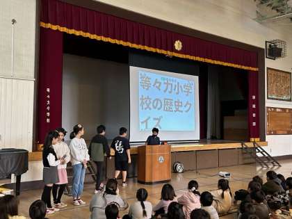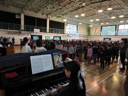 計画委員さんと集会委員さんが、開校記念日集会を企画し行ってくれました。等々力小学校のこれまでの歴史を紹介してくれたり、クイズを出してくれたりしました。事前に過去の記念誌を調べ、紹介する内容を考えてくれました。素晴らしい取組です。集会の最後はみんなで校歌を歌いました。伴奏は6年生の児童です。等々力小学校をより良い学校にするために子どもたちが主体的に取り組んでくれています。