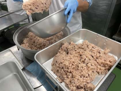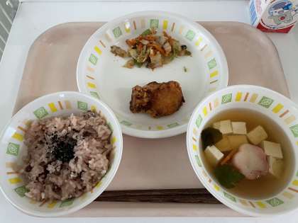 今日は等々力小学校68回目のお誕生日、開校記念日ということで、お祝いのメニューにしました。お祝いに欠かせないお赤飯は、小豆とお米と餅米を使って炊きました。上にかけたごま塩も、黒胡麻と塩と水で給食室で作りました。主菜は、大人気の鶏肉の唐揚げを作りました。すまし汁は、昆布と花かつおで丁寧に出汁をとって、花麩やみつばを浮かべました。