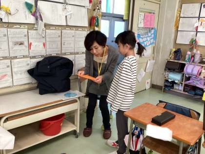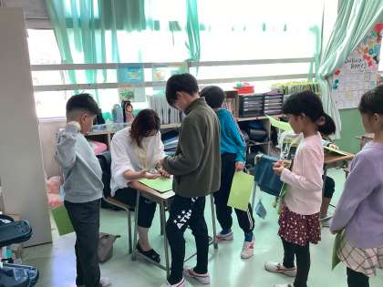 子どもたちは、ボランティアの保護者の方に九九を聞いていただき、九九検定カードにサインをもらっていました。