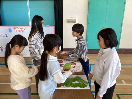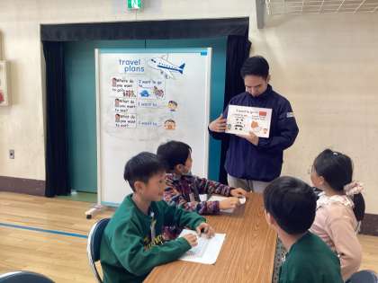 今日は、ボーダリンクさん主催による、外国語特別レッスンがありました。2時間続きで外国語の学習を行い、子どもたちは「道案内の仕方」「外国旅行の計画の仕方」「買い物の仕方」について学びました。