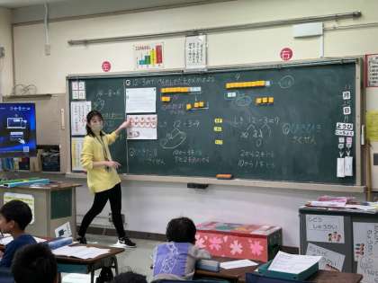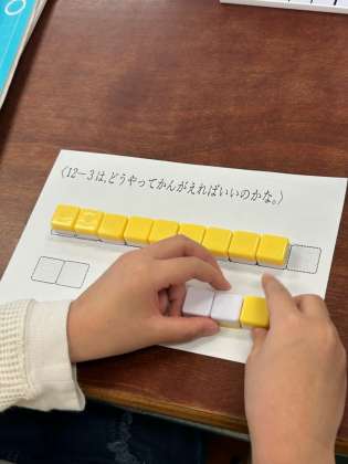 繰り下がりのある引き算を学習している1年生。今日は、「12−3」の計算の仕方を考えました。「2から3はひけないから、10のまとまりから3をひいて7。一の位に2があるから7+2で答えは9」という減加法で考えた子、「3のうちの2つ分だけ一の位の2からとる。あと1つ取りたいから10—1で答えは9」と減減法で考えた子といましたが、ブロックや式を使いどちらが分かりやすいかみんなで考えました。みなさんはどちらが計算しやすいですか?1年生なりに数学的思考力をはたらかせて一生懸命に考えていました。