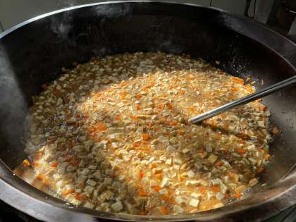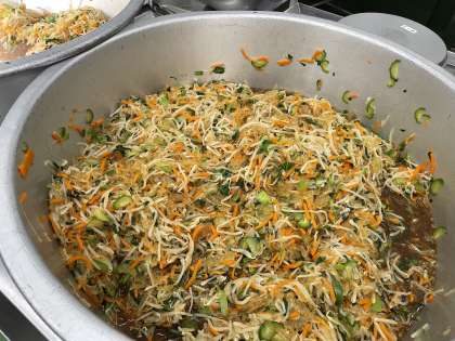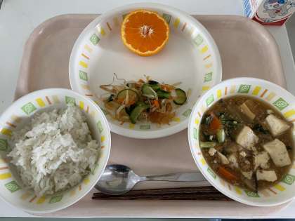 生揚げそぼろあんかけは、生揚げとひき肉と野菜を、削り節の出汁と醤油、砂糖、お酒で煮て作りました。生揚げは厚揚げとも呼ばれていて、木綿豆腐を油で揚げて作られています。予算の都合で、生揚げと豆腐を届けてもらい、作りました。ごはんとの相性バッチリで美味しく出来上がりました。糸寒天は、寒天を細長くしてサラダやスープ用に加工した食材で、プリプリとした食感が美味しいです。野菜と特製ドレッシングと和えました。