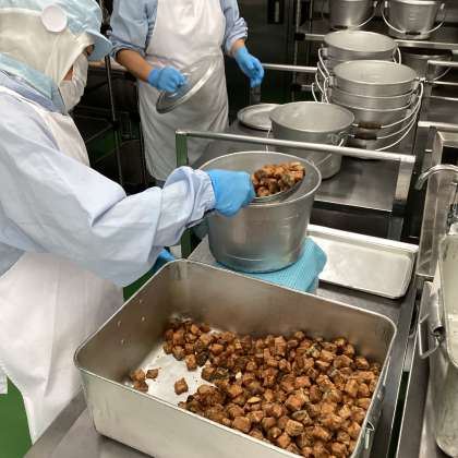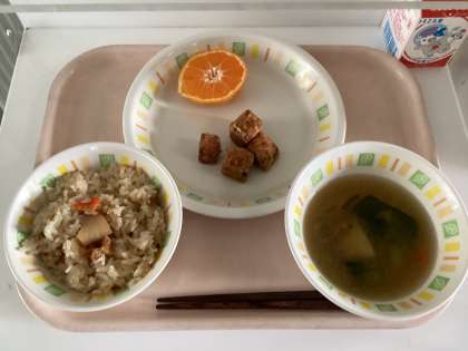 今日の給食は、冬に美味しい食材をたくさん使いました。ごはんに入っている「里芋」「にんじん」、竜田揚げにした「ぶり」、みぞれ汁の「大根」「小松菜」、デザートのみかんです。ぶりは冬になると脂がのって美味しくなります。小松菜やみかんは、体の中でビタミンAに変わるカロテンが多く、風邪を防いでくれたりお肌の健康を保ってくれます。みぞれ汁には、機械でおろした大根をたっぷり使いました。削り節と昆布の出汁と、大根の甘み、かまぼこの旨みが合わさって、とても美味しいみぞれ汁が出来上がりました。