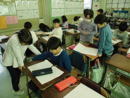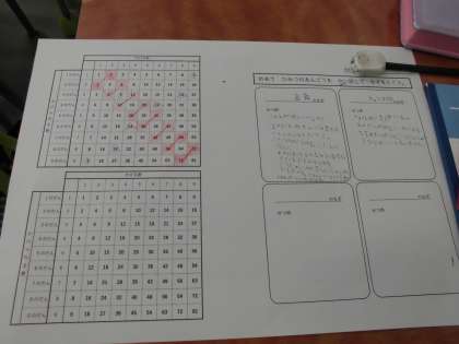 別のクラスでは、先ほどの規則性を発見する授業の次の時間。秘密を見つけたことを使って、謎解きをしました。「直角の謎」「蝶ネクタイの謎」「ビックリマークの謎」など、この謎が九九表のどんな規則性なのか、これまでの学習を活かしてたくさん考えました。かけざん九九は覚えると便利に計算できるだけではなく、九九表は数学的な思考力を育てることにもつながります。ご家庭でも見付けてみてください。