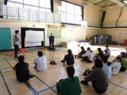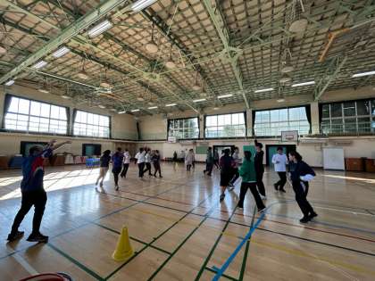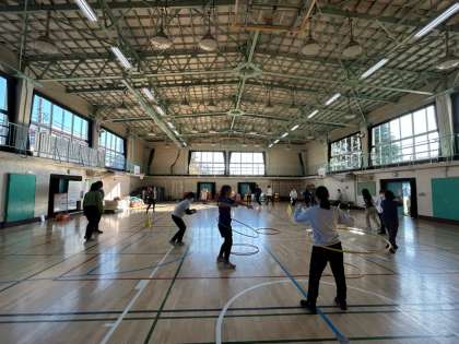 テーマは体つくり運動。体力の大切な要素(巧みな動き、力強い動き、動きを持続する能力、体の柔らかさ)を子どもたちが高めるために、教師はどのようにすれば良いのかなどの理論的な講義から、実際に先生方もやってみてみました。まずは体ほぐしの運動から。言うこと一緒、やること一緒やUFO、あんたがたどこさなどです。続いて用具を使った動きなどもやってみました。先生方も笑顔で楽しみながら研修することができました。明日からの授業改善に活かしていきます。