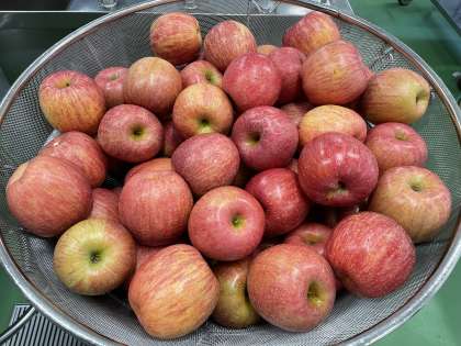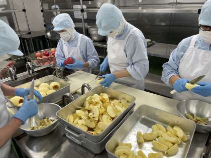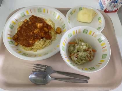 チリビーンズライスは、ひき肉と、にんじん、玉ねぎ、を炒めて、大豆やじゃがいもと一緒にホールトマトなどで煮込んで作りました。チリパウダーのスパイシーで、少しピリ辛の味付けでしたが、子どもたちに大人気で、どのクラスもほとんど空っぽになっていました。りんごは、山形県産のサンふじというりんごで、蜜が入ってとっても甘くて美味しいりんごでした。