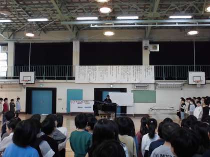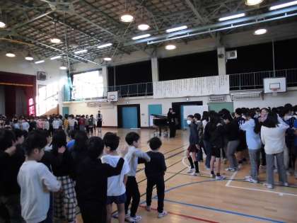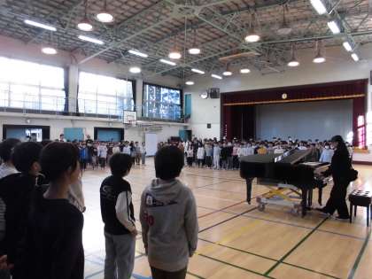今朝は、2、4、6年生は音楽朝会、先週1、3、5年生が歌った「Tomorrow」を合唱しました。美しい歌声が体育館に響きました。