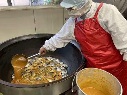 さばの味噌煮は、さばとネギと生姜を並べて、赤味噌、砂糖、お酒、みりんを合わせたタレと水をかけたら、シートを上にかぶせて、2時間くらいコトコト煮て作りました。味が染みてとっても美味しく出来上がりました。ごはんと一緒に食べると、とっても相性バッチリで美味しく出来上がりました。魚が苦手な子もチャレンジして、美味しさを発見していたようです。