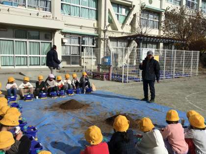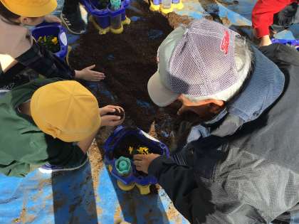 今日は1年生が「チューリップ」と「ビオラ」の寄せ植えを行いました。鈴木農園さんに土の入れ方から丁寧に教えていただきました。球根を初めて見たという子どもたちも多くいました。咲く時期は少し先になりますが、「早く咲いて欲しいな」と春を心待ちにしているようでした。