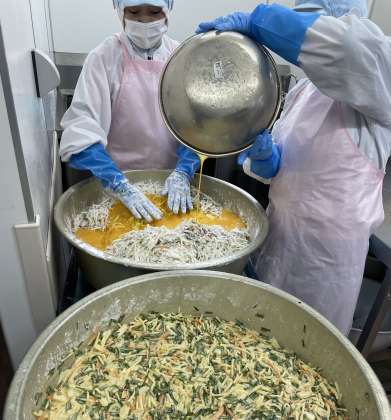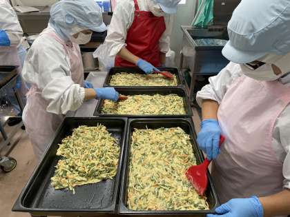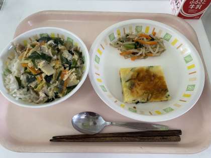 クッパは韓国料理で、「クッ」がスープのこと、「パフ」がごはんのことを表す言葉だそうです。ごはんとスープを合わせて食べる料理です。チヂミは、じゃがいもの千切り、にら、にんじんの細切り、いかを混ぜ合わせて、小麦粉と水と卵を加えてよく混ぜ合わせ、型にしきつめて、オーブンで焼き、カットしました。上にかけたタレも給食室特製の甘辛いタレです。クッパとチヂミも人気でしたが、塩ナムルも大人気で、おかわりの行列ができていました。