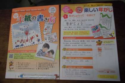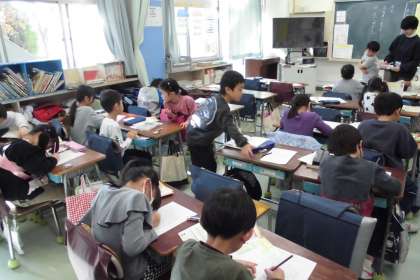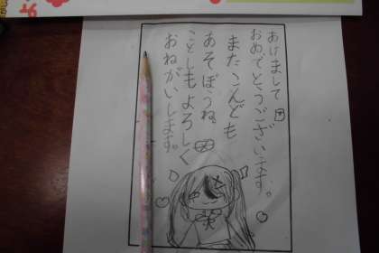 生活科で「お手紙」の書き方を学習している1年生。日本郵便(株)にご協力いただき、年賀状を書いています。まだ下書きですが、おばあちゃんやおじいちゃんなどへ送る心温まる年賀状が完成間近です。