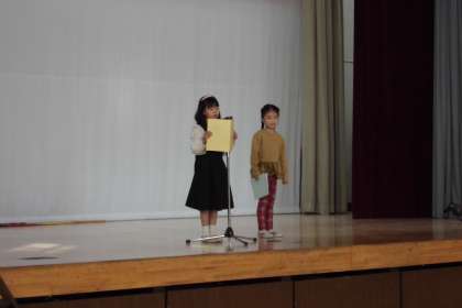 児童代表の言葉は1年生。2学期に頑張ったことなどを話してくれました。「私は、2学期長縄跳びを頑張りました。話し合って休み時間に練習する日がきまりました。私は最初跳べませんでしたが、友達が『もうちょっと真ん中で跳ぶといいよ。』と言ってくれて、跳んでみるときれいに跳べて嬉しかったです。クラスの目標回数よりもたくさん跳べてみんなで喜びました。」
