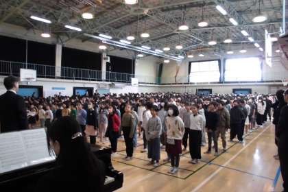 「漢字を頑張りました。最初は漢字のすきまが同じ大きさで書けませんでした。でも毎日宿題で漢字をゆっくり書いて練習したら書けるようになり、とても嬉しかったです。音楽ではいろいろな歌や鍵盤ハーモニカを習いました。1学期の時は指使いができなかったけれど、気を付けて練習したらできるようになりました。嬉しかったし、いろいろな曲に挑戦できて楽しかったです。3学期もいろいろなことに挑戦したです。」などと話してくれました。662名の子どもたちを前にして緊張したと思いますが、立派に話すことができました。素晴らしかったです。