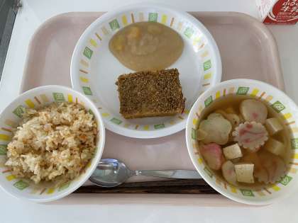3学期の給食が始まりました。今日はお正月にちなんだ料理でした。「あけぼのごはん」は、にんじんのすりおろしを混ぜた炊き込みご飯です。「あけぼの」とは、夜明けの頃を示す言葉で、夜明けの空が少しずつオレンジ色になる様子や、何か新しいことが始まる様子を表すこともあります。にんじんは、冬の今が旬で美味しくなる頃ということもあり、一年の始まりにぴったりのごはんです。松風焼きと豆きんとんは、おせち料理の一つです。松風焼きは、表裏なく正直に生きることを願う料理で、きんとんは、勝利や金運上昇を願う料理だそうです。すまし汁には、富士山と日の出が描かれた「なると」や花麩を浮かべました。