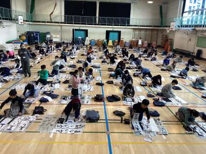 学年全員が体育館に集まり、春の海をBGMに静かに取り組みました。