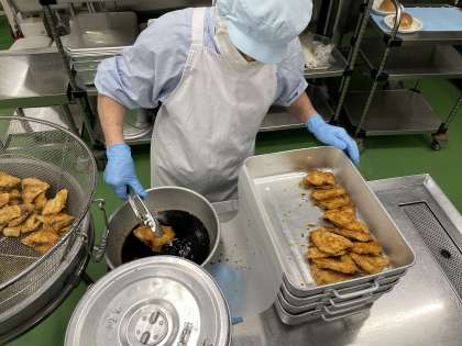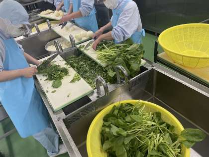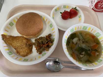 和風フィッシュサンドは、メカジキに下味をして片栗粉をつけて油でカリッとあげて、甘辛いタレに潜らせたものと、きんぴらごぼうを、米粉パンにサンドして食べました。お魚ときんぴらごぼうが、米粉パンとの相性バッチリでとっても美味しいです。スープには仕上げに茹でた小松菜を入れました。この小松菜は、2年生が収穫体験に行った秋山農園さんで採れた小松菜を分けてもらったものです。「せたがやそだち」の小松菜を味わっていただきました。