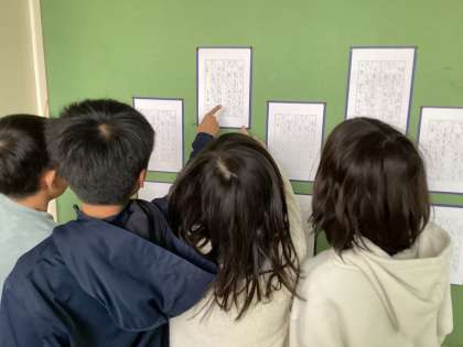 今週から書き初め展が開催されています。低学年は硬筆、3年生からは毛筆の出展になります。兄弟学年の作品を鑑賞したり、来年の学年はどんな書き初めを書くのかなと楽しみに鑑賞したりしました。明日までが書初め展です。是非ご来校いただきご覧ください。
