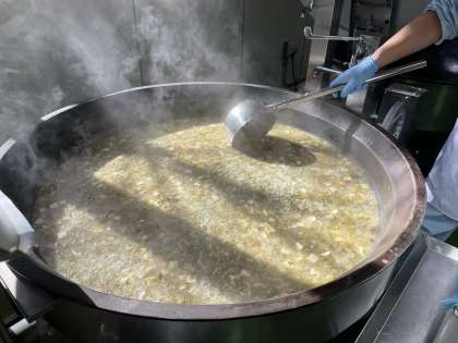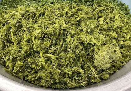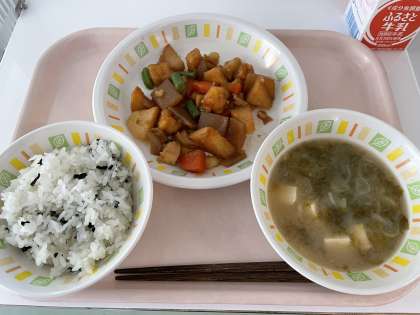 味噌汁には、「あおさ」、豆腐、ネギ、なめこを入れました。あおさは、海の中で育つ海藻の仲間です。あおさの中にも数種類あるそうですが、食用のあおさの材料になるのは「アナアオサ」という種類がほとんどだそうです。広げると穴が空いている平べったい海藻です。青のりと似ていますが、使っている海藻が異なるそうです。青のりの方が良い香りがするそうですが、あおさもとても香りが良いのが特徴で、お味噌汁に少し加えるだけで、海の香りがします。