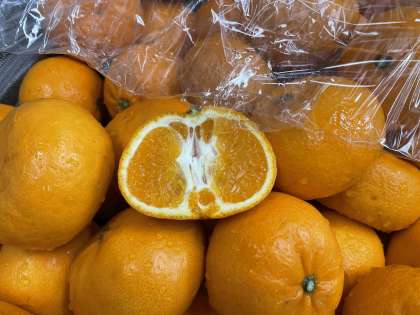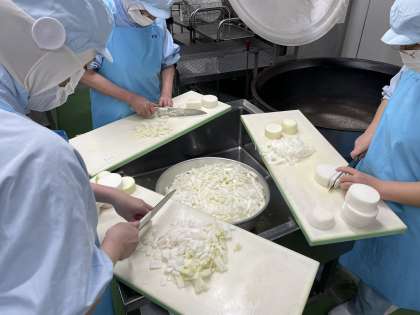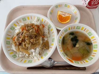 おろし豚丼は、大根を半分はすりおろして、半分は短冊に切って、玉ねぎや豚肉と一緒に炒め煮て作りました。冬が旬で美味しい大根をたっぷり使って、甘辛い味に仕上げました。ごはんとの相性バッチリで、美味しく出来上がりました。はれひめは、12月から1月にしか出回らないみかんで、とても甘くてジューシーで美味しいみかんです。