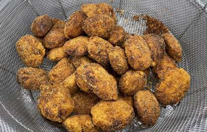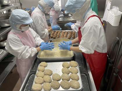今日は、東京都の食材を使った「むろあじのメンチカツ」の登場です。東京都の伊豆七島の一つ、三宅島から届いたむろあじミンチを使って、メンチカツを作りました。炒めた玉ねぎ、鶏ひき肉と調味料、パン粉、牛乳などを合わせて、衣をつけて、油で揚げました。お肉のような食感で、お魚と思わずに食べている子もいました。
