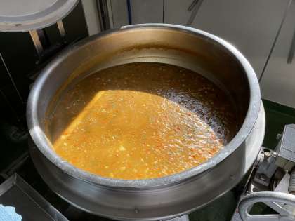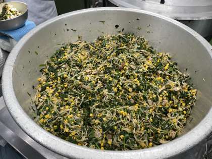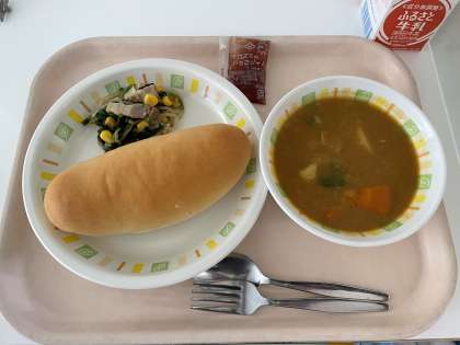 全国学校給食週間の4日目は、昔ながらのコッペパンと、カレーシチューを作りました。カレーシチューは、カレーライスが登場する前に大人気のメニューだったそうです。校長先生も子どもの頃に大好きな給食だったそうです。ルーの小麦粉が少なく、カレーライスよりもサラッとしています。カレーライスと違って、レンズ豆や、さやいんげんなども入れました。昔の給食で食べられていたコッペパンは、限られた材料や設備で作られていたので、少しパサパサしたパンだったそうですが、だんだんと美味しいパンに改良されていき、今ではふわふわの美味しいパンを届けてもらえるようになりました。