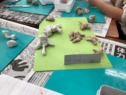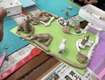 等々力小学校では、年に数回副籍交流をしています。今日は2回目の交流をしました。粘土で動物を表現し、グループで集まり一緒に「等々力動物園」をつくりました。まず、動物園にいそうな動物を考え、グループで話し合い担当を決めました。「カバが、大きく口を開けているところをつくりました。」「パンダが、赤ちゃんを抱っこしています。」など工夫して表現していました。交流が終わった後は、名残惜しそうに玄関までお見送りをしました。7年度も交流ができるといいですね。
