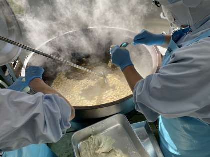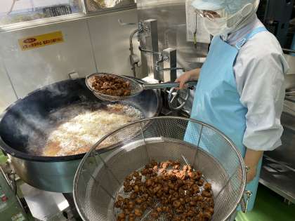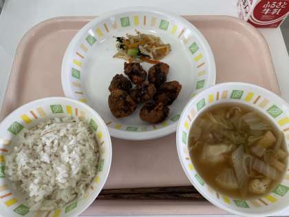今日は全国学校給食週間の最終日でした。昭和50年〜70年代に給食でよく登場していた鯨の立田揚げを作りました。角切りの鯨を、しょうが、にんにく、玉ねぎ、大根、りんごのすりおろしと調味料に漬け込んで、粉をつけて油でカリッと揚げました。鶏肉のような牛肉のようなお肉で、子どもたちもたくさん食べていました。すいとんも、昔の給食でよく登場していた料理です。小麦粉と片栗粉と塩を水と混ぜてこねて、出汁にスプーンで摘み入れて作りました。