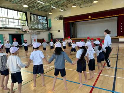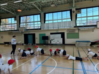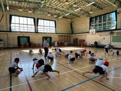 先日1年生は表現リズム遊びをしているとお伝えしましたが、今日は別のクラスも取組ました。ジャングルにたくさんの動物が出現、みんな体全体で動物になりきって表現しました。ゾウが水を吸って水をまいたり、泳いでいて獲物を捕まえる時のワニを表現したり、みんないろいろと工夫しています。