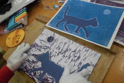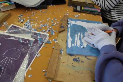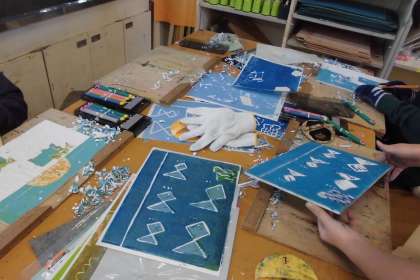 「重ねて広がる形と色」という題材で版画に取り組んでいます。何色か分けて刷ってみると、すてきな版画の作品が出来上がります。版画の良さは何枚も刷ることができることですね。