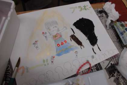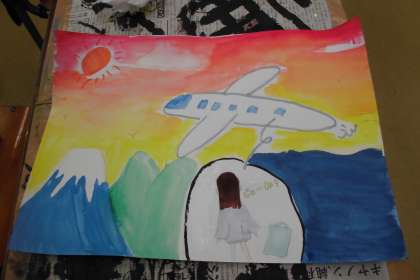 「将来の自分」をイメージした絵を描いています。飛行機に乗って世界一周をしている自分。スポーツ選手になっている自分、ピアニストとして活躍している自分と様々です。みんな楽しそうに描いています。