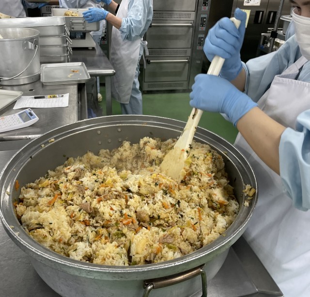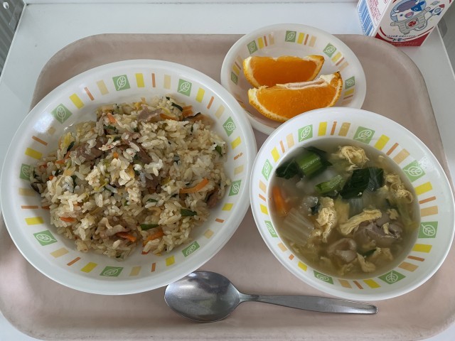 キムチチャーハンは、大人気のメニューの一つです。おかわり、増やしの行列ができるほど人気でした。トックスープは、韓国のトックという丸いお餅が入ったスープです。野菜や、お肉、卵も入った具沢山のスープです。