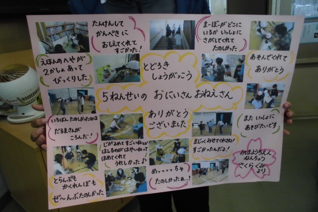 昨日、近隣の幼稚園、保育園の子どもたちを等々力小学校にご招待して、5年生と交流を行ったとお伝えしましたが、今日三島幼稚園から、嬉しいプレゼントが届きました。三島幼稚園のさくら組の子どもたちの交流した感想をまとめてくれたお手紙です。5年生の子どもたち喜んでいました。頑張ったご褒美ですね。