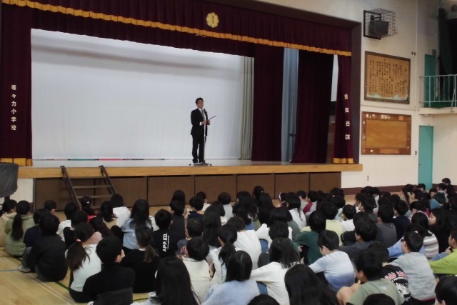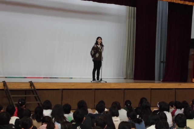 「今日は人との関わり、交流が素晴らしいというお話です。まずは1年生と6年生との交流会。卒業前の6年生のイベントに、1年生を招待してくれました。3年生は、お世話になった4年生を招待して、各クラスお祭りを行いました。招かれた学年も、招待した学年のみなさんもとても楽しそうで、校長先生はとっても嬉しくなりました。