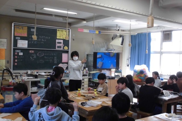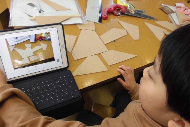 「のこぎりで切った板を組み合わせて、つかって楽しいもの作ろう」が今回の題材です。様々な形に切った板を並べたり、立体にしたりしながら、イメージしていきます。偶然の組み合わせでできた形が動物に見えたり、道具に見えたりしていきます。崩すと思い出せなくなるので、できたアイディアは写真に撮り、また別のアイディアを考えます。ホワイトボードも貼ることができるので、家で使えるメッセージボードなどができそうです。完成が楽しみですね。刃物を使っていますが、みんな安全に使用していて素晴らしかったです。