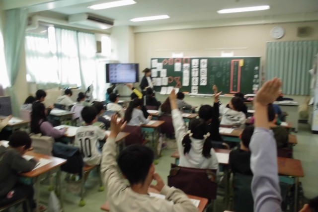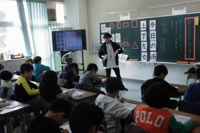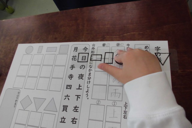 今日の書写の時間のめあては「文字の形(外形)に気を付けてていねいに書こう。」です。外形とは、文字のまわりを囲んだ形のことです。『形めがね』が登場し、これまでに学習した漢字やひらがながどの外形だとバランスがよいのか考えました。算数で形の勉強もしているので、みんなこの漢字は「正方形だね!」などと意見を共有しながらバランスよい字をめざして書くことができました。これからも意識して書けるとよいですね。